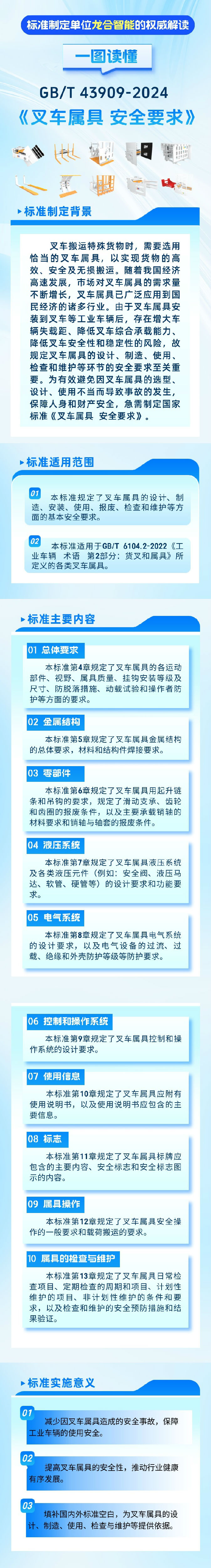 龍合智能裝備制造有限公司自2017年3月開始擔任屬具工作組組長單位以來,在上級標委會的指導下、在全體組員的共同努力下,卓有成效地開展了許多工作,為促進我國工業車輛標準體系建設和促進行業整體技術進步做出了積極貢獻。截至目前,我國工業車輛屬具專業領域共有現行有效標準20項(其中國家標準3項,行業標準17項);已完成報批待批準的行業標準7項;在研的屬具標準制修訂計劃項目共8項(其中國家標準2項、行業標準6項)。